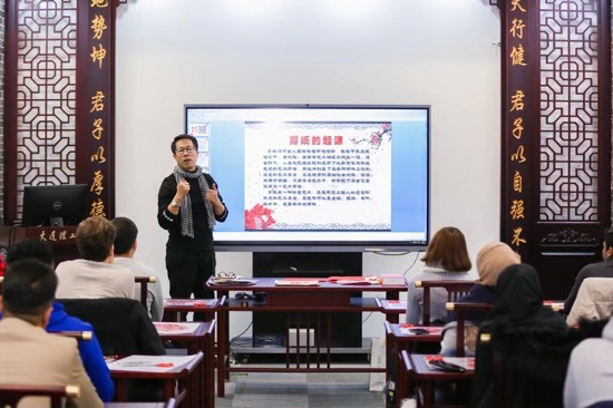 剪纸作为我国宝贵的非物质文化遗产入选了“人类非物质文化遗产代表作名录”,为了使国际学生感悟中国传统文化,体验中国文化之美,12月10日, “中华文化书架”非物质文化遗产剪纸沙龙活动在国际教育学院智慧教室109举行。辽宁省民间剪纸艺术代表性传承人毕务福老师为国际学生上了一节剪纸体验课,剪纸沙龙活动吸引了数十位国际学生参加。
