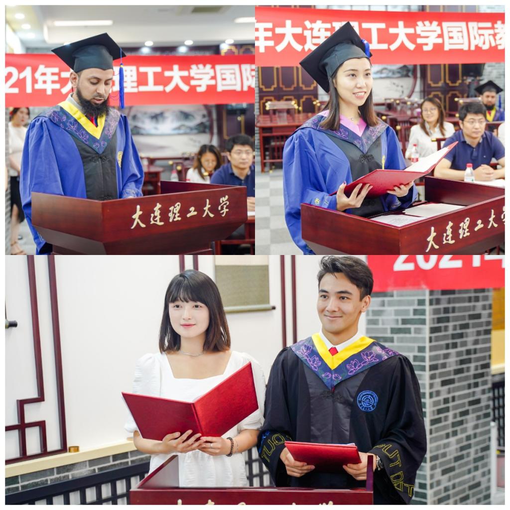 随后,国际学生辅导员分别宣读了国际教育学院2021届中外毕业生名单。郝海院长为到场毕业生代表授予学位。本次仪式在充满温情的毕业生视频中结束。走向世界的国际毕业生是沟通中外、联接东西的桥梁和纽带。他们心中的大工情怀和中国故事仿佛星星之火,可以照亮东方大国通往五湖四海的路。在推进中外人文交流、促进文明和谐共生的新时代里,国际教育学院与毕业中外校友将砥砺奋进,知行合一,用我们的努力让世界更好地了解立体的中国,为服务于文明和谐与共同繁荣贡献更多力量。