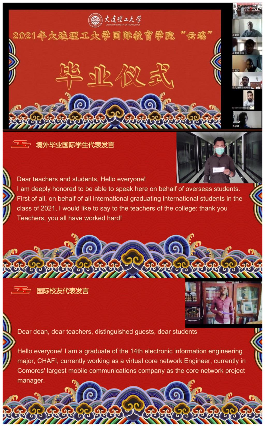 境外毕业生代表陈瑞克在线向师生们表达了因疫情未能返校的国际毕业生们的心声,虽然毕业之时未能如愿回到母校,他对中国、对大工的感情和想念始终未减,也希望不久的将来能够有机会回到中国,重返校园,再感受一下这里生机勃勃而精彩纷呈的生活。陈瑞克表示,中国文化的魅力和中国人民取得的成就让世界瞩目,将把留学所学付诸实践,努力用自己的贡献创造更美好的未来。