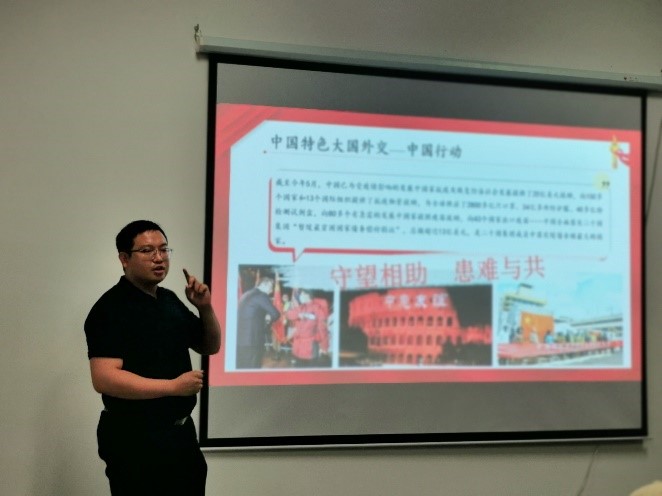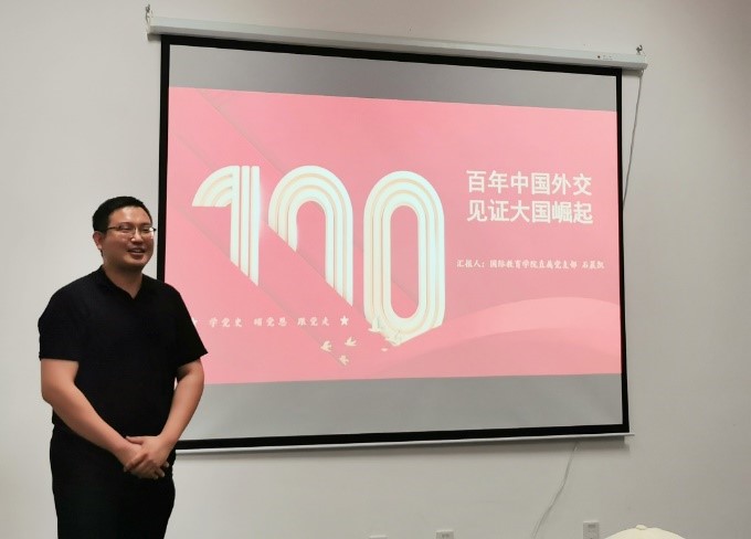 会议的第三部分举行了党史学习主题党课活动。作为学校微党课竞赛三等奖的获得者,石晨凯老师在会议上激情讲述了中国外交的百年变迁,从“弱国无外交”到“和平共处五项原则”,再到如今“中国特色大国外交”,这场跨越百年的外交故事,让收听者深深的体会到党的外交外事工作取得了举世瞩目的重大成就。通过党课的讲授,每一位参会者均能感受到当下中国外交所展现的大国担当,为世界贡献的中国智慧、中国理念、中国方案,以及在共同构建人类命运共同体的积极推动作用。