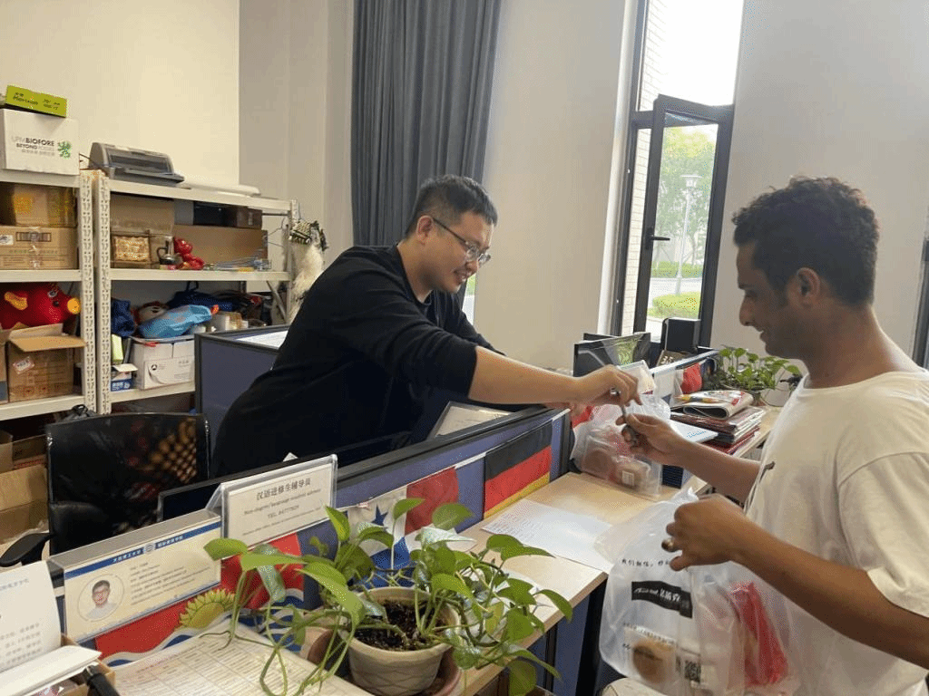 在发放月饼时,老师们向国际学生介绍了中秋节的习俗和传说,为学生们送上真挚的佳节的祝福,与各年级学生就近期的学习生活、遇到的困难和问题进行简要交流,借此机会鼓励国际学生,尤其是新生们努力学好汉语和专业知识,成为知华友华爱华的文化交流使者。让国际学生感受到中国传统节日的温馨氛围和学校、学院家人般的温暖。