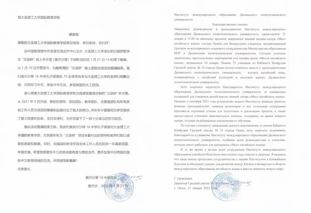 近日,由教育部中外语言交流合作中心主办,大连理工大学承办的2021年白俄罗斯学生“汉语桥”线上冬令营圆满落下帷幕。来自白俄罗斯奥尔沙第16中学孔子课堂的75名学员和来自莫吉廖夫薇老师中文学校的45名学员分别用两周时间完成了冬令营课程的学习。