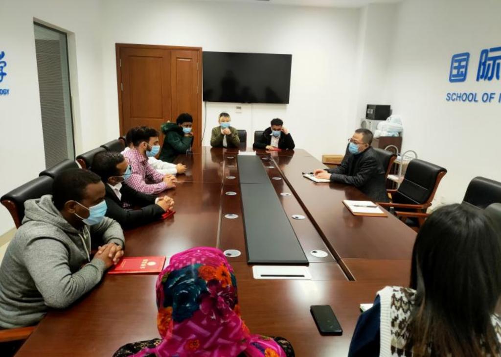 新冠疫情再次在全国多地爆发,国际教育学院从严从紧抓好疫情防控工作,努力筑牢疫情防线,用实际行动维护学校安全与师生健康。近日,住校工作的国际教育学院院长段玉平教授与国际学生代表们亲切座谈,了解学生们在疫情封校期间的困难和需求,并深入博留公寓走访慰问在校国际学生。