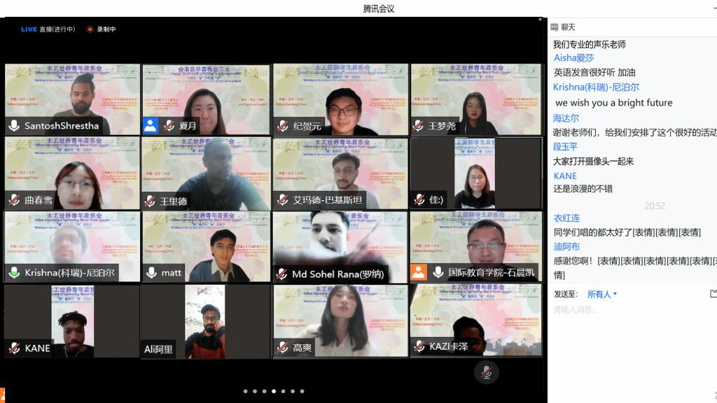 本次音乐会由校团委和留学生办公室提供支持,是我校国际学生首次在音乐中相聚交流的线上活动。音乐会上通过歌唱各自的民族歌曲促进学生之间的真情融合,为生活注入生机与活力;通过来自五湖四海的大工世界青年们共同唱响《名字叫中国》,以特别方式为大工、为中国加油,展现出他们的友好情怀与国际胸襟,也为疫情当下国际学生的生活增添了信心与笑容。