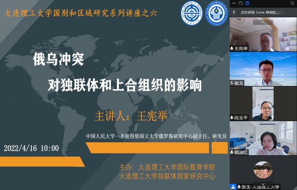 国际教育学院院长段玉平教授首先致辞感谢王宪举研究员对大连理工大学的支持,指出当前俄乌冲突不仅受到了国际社会各方面关注,也值得我校师生深入的思考,在疫情防控封校管理期间举办这样的学术交流活动十分必要。
