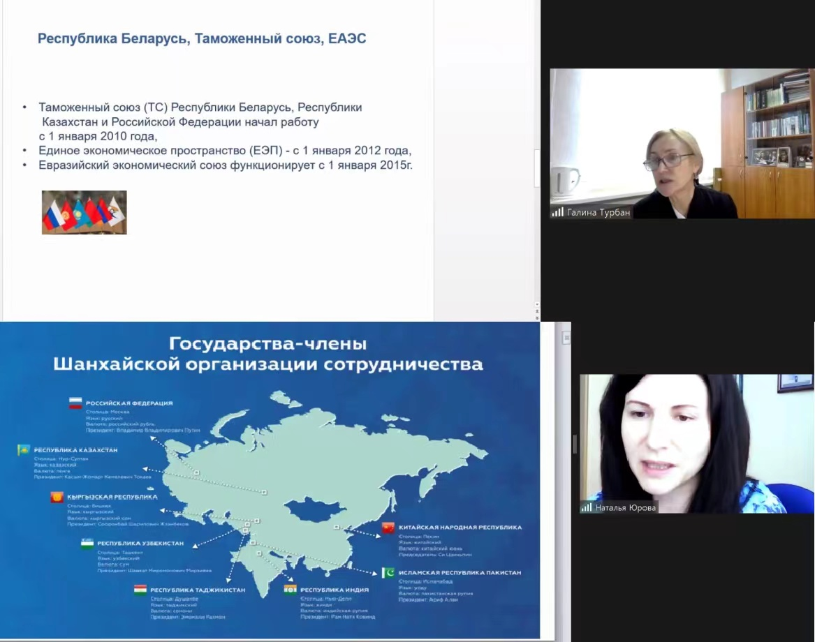 5月17日,中心成功与白俄罗斯2所高校举行研讨会。白俄罗斯国立大学YURAVA NATALLIA 副教授和白俄罗斯国立经济大学国际贸易教研室主任TURBAN GALINA 副教授分别针对上合组织间国家经济关系和中白两国的经贸合作前景做出分析和预测。