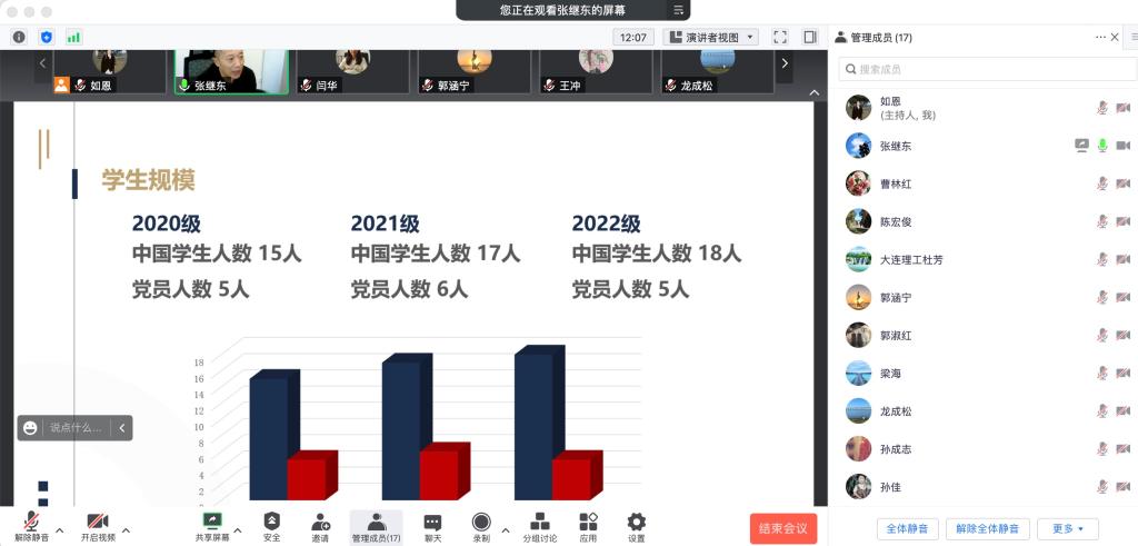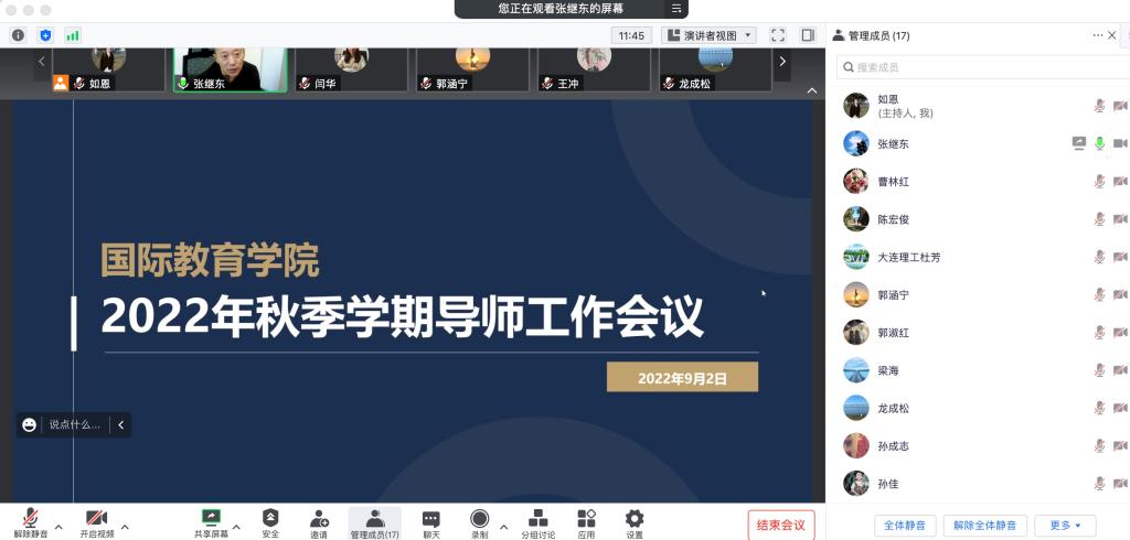 会议根据《大连理工大学国际教育学院研究生指导教师工作导则(2022 年修订)》等文件,进一步夯实导师工作职责,提出本学期导师的工作重点,推动导师在优质生源吸引、研究生培养质量提升和学生思政教育三个方面着力,扎实推进三全育人在专业学位研究生培养工作中落地见效。