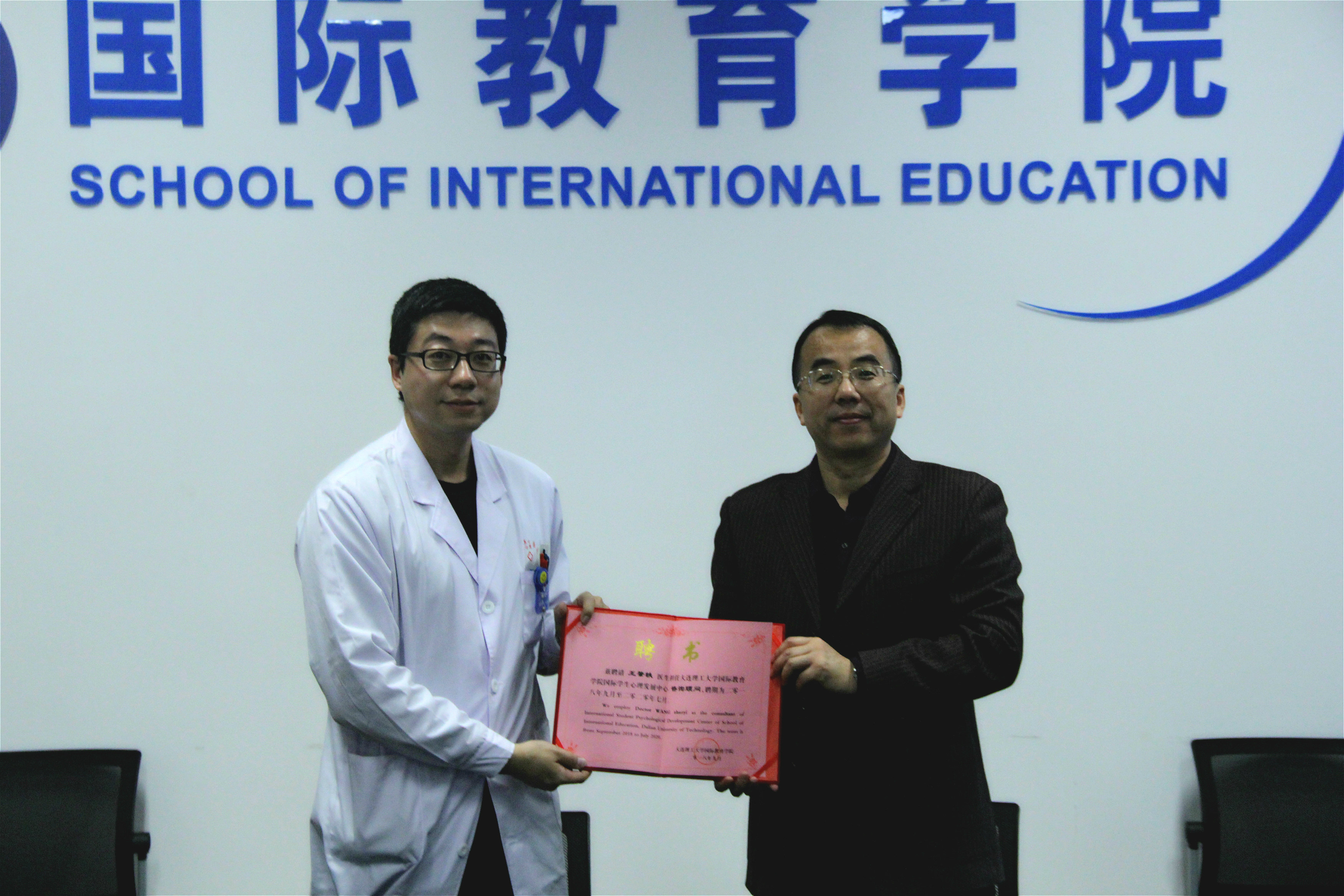 座谈结束后,郝海院长代表国际教育学院参与了继续聘请王肇轶医生为大连理工大学国际学生心理发展中心咨询顾问的签约仪式,并为王医生颁发了的聘书。本次讲座是学院加强队伍建设的措施之一,将有效的帮助教职员工化解工作压力,提升自我调整能力,建立更和谐的师生关系,加强情绪和时间管理能力,更加积极和高效的投入工作。