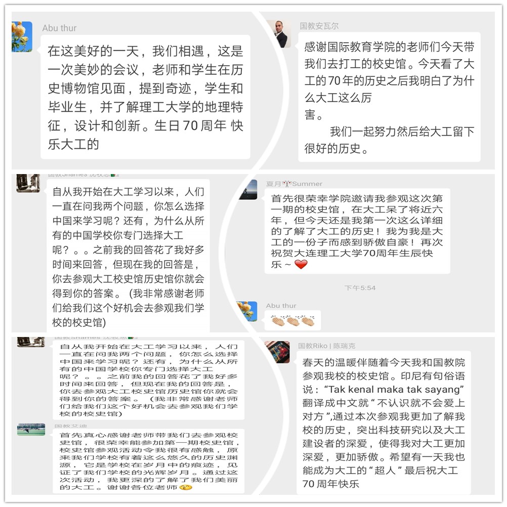 参观结束后,国际学生们感触颇深,分享起自己的感受。来自巴基斯坦的阿巴斯说:“今天参观校史馆的经历将会成为我在DUT生活的记忆中弥足珍贵的一部分,言语已经无法表达我的兴奋了,我已经推荐我的朋友们也去那里参观、学习”。来自日本的松本夏月说:“我为我是大工的一份子而感到骄傲和自豪!再次祝贺大连理工大学70周年生辰快乐!”,来自印尼的陈瑞克说:“通过本次参观我更加了解了我校的历史,突出科技研究以及大工建设者的情怀,我对大工更加热爱,对作为大工人更加骄傲。希望有一天我也能成为大工的“超人”!最后祝大工70周年生日快乐!。