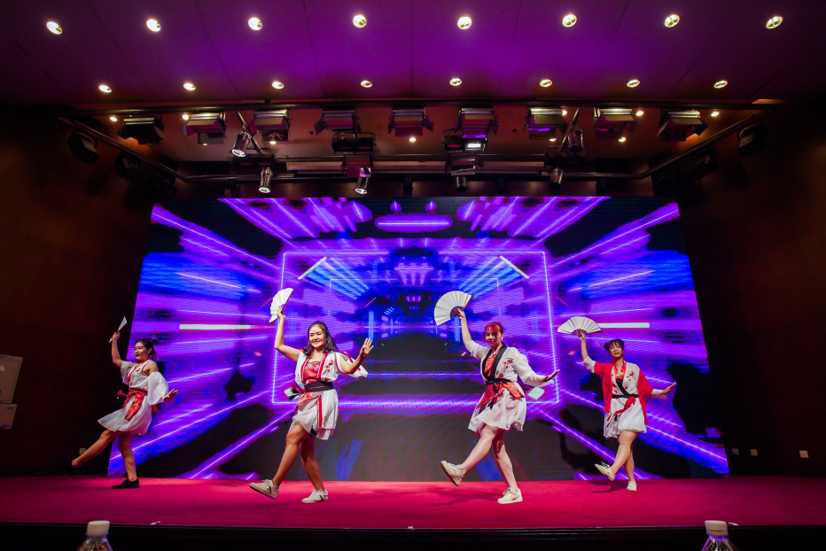 初三C班全体学生表演的小品《书本里的蚂蚁》改编自初三年级教材阅读课文,将课堂所学与课外表演完美结合;杂技表演《抛球》,深刻的将力量与技巧相结合,秀出了大工国际学生别样的魅力;配音表演《功夫熊猫》,充分体现了学院对国际学生日常中文培训的成果;中二全体学生的诗朗诵《再别康桥》、歌曲演唱《同桌的你》表演的淋漓尽致;来自院系的四名国际学生的太极扇表演,融音乐与太极扇舞于一体,表现得惟妙惟肖、一板一眼;歌舞表演《寄明月》,融合中国传统乐器与现代电子乐,借鉴多民族元素,将不同元素的曲风、舞蹈、视觉画面融合创新,力求突破次元壁,将现场观众带到另一个时代,为之震撼。