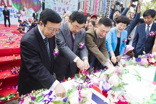 校党委书记王寒松,副校长宁桂玲,大连市公安局出入境管理局局长张军,日本驻连领事处总领事平川智雄一道切开象征国际文化节成功举办四周年的主题蛋糕,标志着第四届国际文化节正式启幕。