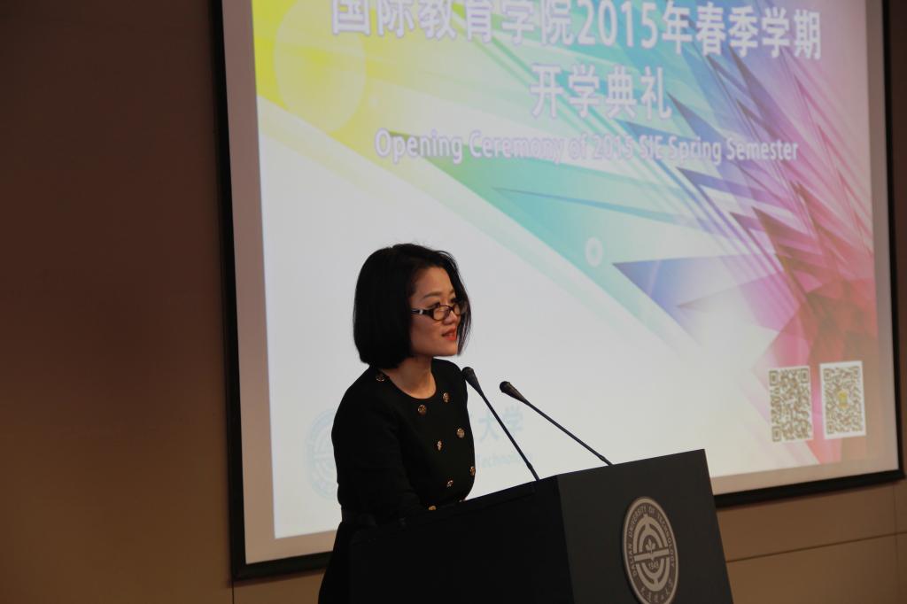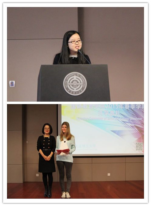 早上九点,开学典礼在主楼报告厅正式开始。这之前,巡回播放的学校学院精彩视频为国际新生们讲述了这个与新中国同龄的校园和这个充满青春活力的学院的种种故事。仪式上,国际教育学院副院长郭晓郁老师首先致欢迎辞,她鼓励新生们在大连理工大学广交朋友,多用汉语与中国学生交流,相信选择理工这所国内名校将是国际学生们实现梦想的决定。