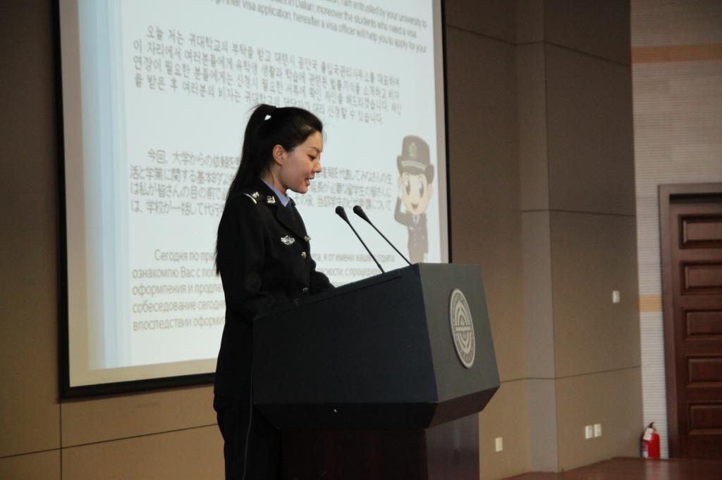 典礼仪式结束后,大连市公安局出入境管理局外国人管理科毕竞元科长为2015年春季学期新生进行了外管法规教育并进行了面签。