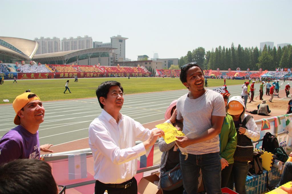 观众台上,各种语言的呐喊声和加油声此起彼伏。同步进行的抽奖环节也让现场的气氛愈发热闹起来。大连初夏的阳光明媚而温暖,观众席上的国际学生热情高涨,为赛场上挥汗如雨的运动员欢呼助威。院长的出现,使国际学生的热情达到顶峰,伴随着国际学生的欢呼声和掌声,院长为大家抽取了两个最高奖项,大家纷纷为这两名国际学生的幸运呐喊欢呼。