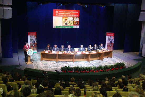 9月11-13日“2013年欧洲部分孔子学院联席会议”在白俄罗斯首都明斯克市中心的共和国宫隆重召开。来自欧洲18个国家72所孔子学院及孔子课堂的中外方院长以及5所中国合作院校校长等近200位代表参加了会议。作为此次会议的承办方,我校党委书记张德祥教授、副校长宁桂玲教授、国际教育学院院长陈宏俊副教授、郭淑红副教授出席了此次会议。