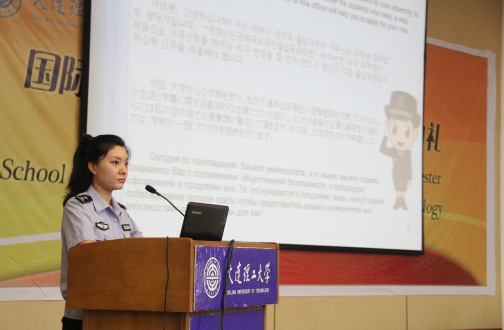 开学典礼的最后一项是大连市公安局出入境管理局的警官对新入学的留学生进行了外管法规宣传,并由四位优秀的留学生分别进行英语、日语、韩语和俄罗斯语的翻译,在场同学认真专注的学习外管法规。
