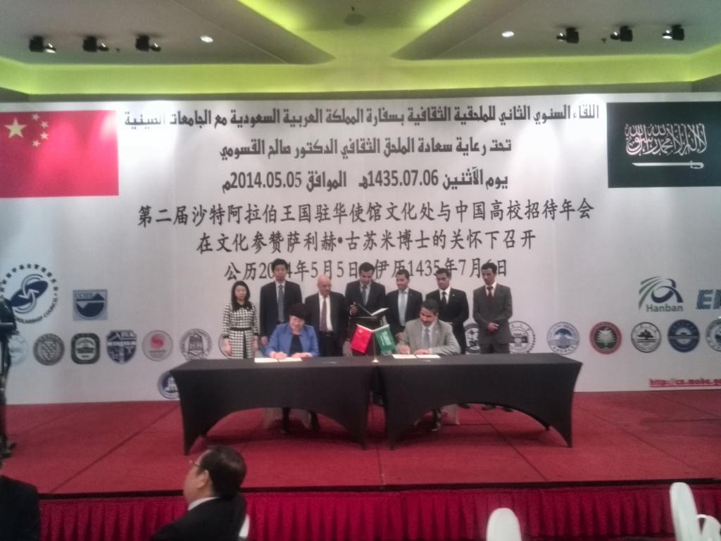 为加强与中国高校的友好合作,促进双方在学术和文化方面的交流,沙特阿拉伯王国驻华使馆文化处在2014年5月5日举办了第二届沙特阿拉伯王国驻华使馆文化处高校招待会。国家留学基金管理委员会来华事务部、国家汉办、孔子学院总部代表,以及中国37所高校的代表与会。我校副校长宁桂玲教授应邀出席,国际教育学院院长陈宏俊、院长助理杜芳陪同参加。