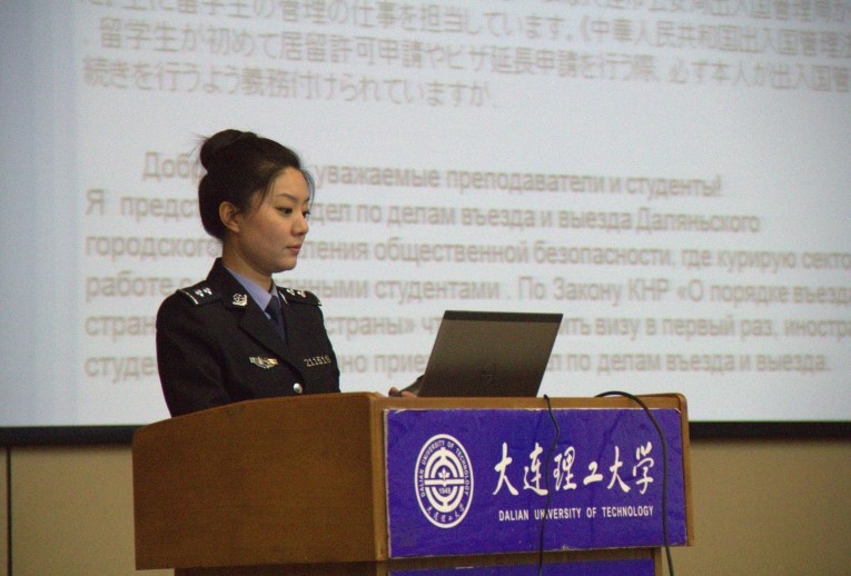 开学典礼最后一项是大连市公安局出入境管理局的警官对新入学的国际学生进行外管法规宣传,四位优秀的国际学生分别进行英语、俄罗斯语、日语和韩语的现场翻译,在场同学认真专注地学习外管法规。开学典礼圆满结束后,国际学生们在外管局警官的组织下进行了面签仪式。
