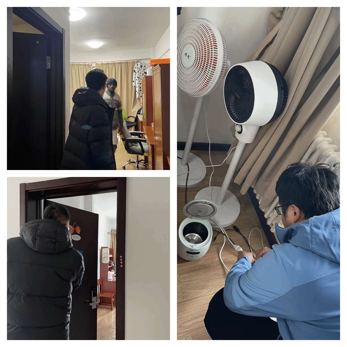 下午14:00,国际教育学院学生事务办公室全体辅导员严格依照《大连理工大学国际学生住宿管理规定》开展入户检查。本次抽查重点针对宿舍安全用电情况,排查是否存在使用超大功率电器、存放易燃易爆物品、私拉乱接电线插排、使用违规电加热设备等现象。
