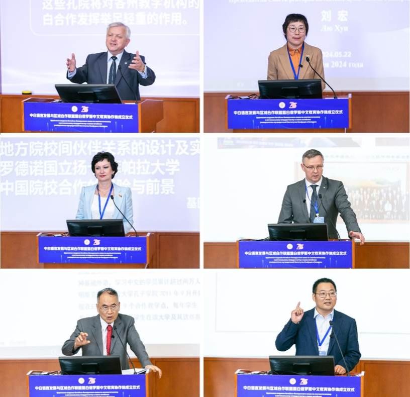 在主旨报告环节,原白俄罗斯副总理、白俄罗斯国立大学共和国汉学孔子学院院长阿纳托利·托济克、大连外国语大学校长刘宏、格罗德诺国立大学校长伊丽娜·基杜尔卡、戈梅利大学校长哈霍莫夫·谢尔盖、浙江树人学院白俄罗斯研究中心主任王宪举和北京第二外国语学院白俄罗斯研究中心主任许传华分别做了题为《白俄罗斯中文教学的发展前景》《上海合作组织大学框架下中白教育合作潜能探索》《区域合作的规划与实施:格罗德诺国立大学与中国教育机构合作的经验与前景》《在戈梅利地区学习和教授汉语》《关于在白俄罗斯开展高级阶段中文教育及对语言与区域国别研究关系的若干思考》《中白语言教育合作与跨文化交流:合作策略与实施路径》的报告。专家们从不同视角阐发观点,有思想碰撞,更有理论共识和使命担当。