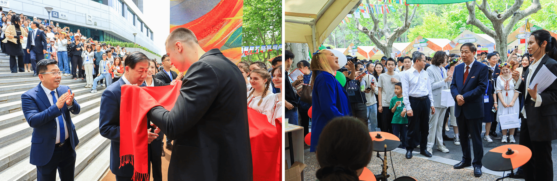 学校党委书记项昌乐首先祝贺第七届国际文化节顺利开幕,世界文化街开街仪式上,项昌乐与留学生代表亲切交谈,询问各国展位情况,鼓励各国学生间增进相互了解,发挥好世界各国文明互鉴和人民友好的桥梁纽带作用。20名在校留学生为参与领导佩戴校庆红围巾,并送上精心准备的特色礼物。