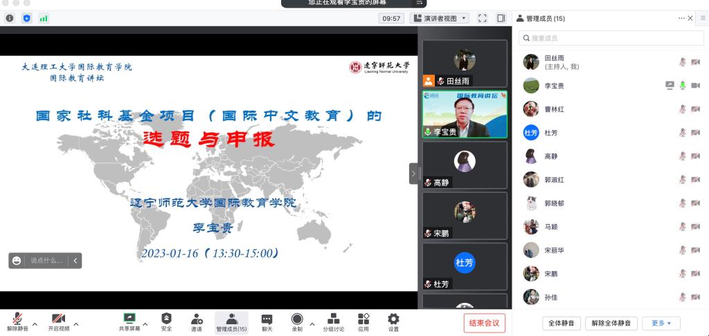 2023年1月16日下午,我院邀请来自辽宁师范大学国际教育学院博士生导师李宝贵教授开展了以“国家社科基金项目(国际中文教育)的选题与申报”为主题的学术讲座。科研秘书田丝雨老师主持,学院教学科研一线教师参加了此次讲座。