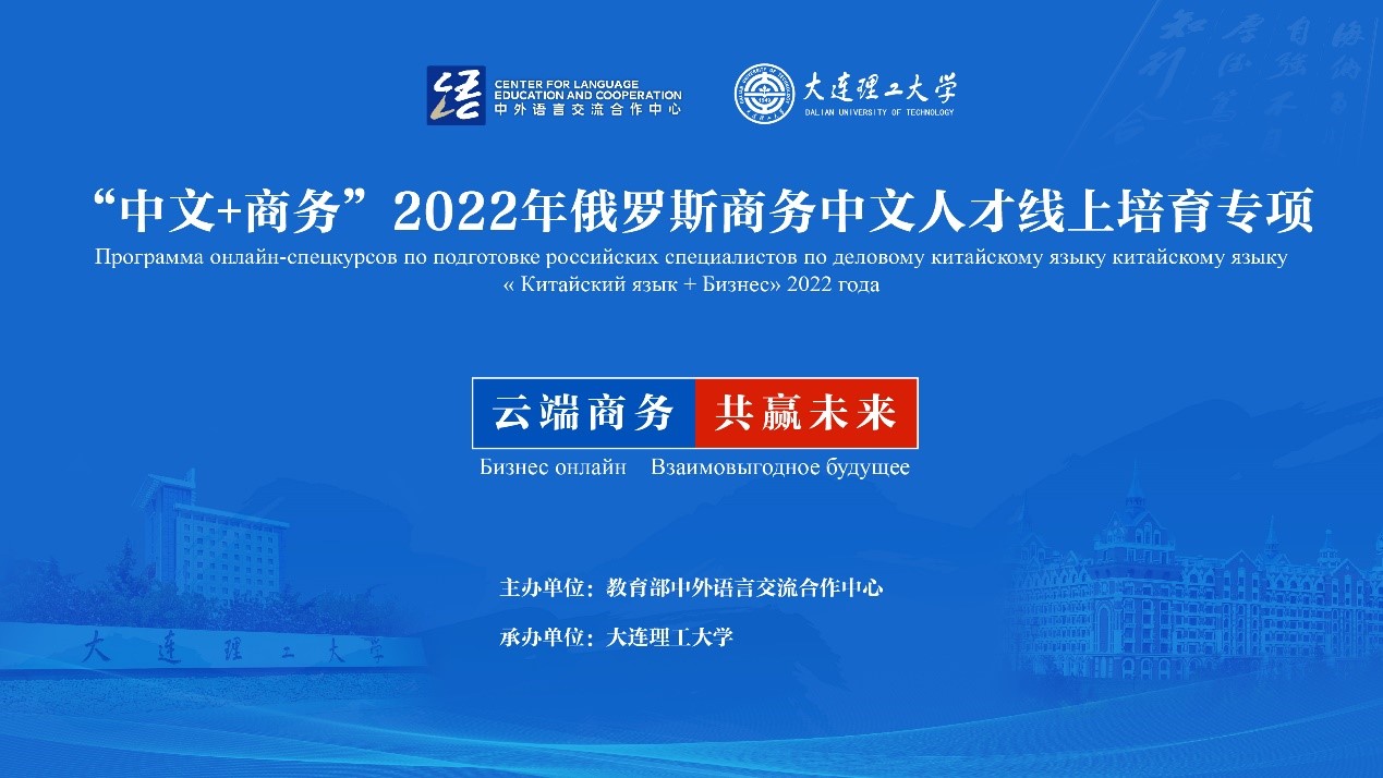1月15日,由教育部中外语言交流合作中心主办,大连理工大学承办的“中文+商务”2022年俄罗斯商务中文人才线上培育专项圆满结束。此项目为语合中心批示我校的重点项目,300名俄罗斯学员与大连理工大学的教师跨越山海,共同开启了一段难忘的云端学习之旅。下面,就让我们共同回顾项目开展过程中的精彩、感动与收获!