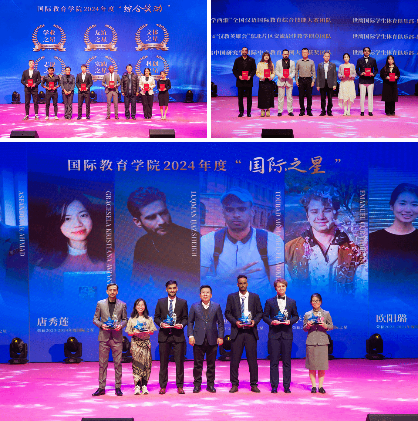 随后举行了国际学生综合奖励的单项奖、卓越团队奖和国际之星奖的颁奖典礼。今年,国际教育学院首次实施国际学生综合奖励评选工作,出台量化评选规则,选树了在学业、友谊、文体、实践、志愿、科创等6个方面表现突出的61名国际学生个人与3支卓越团队,并选树了5名在各个方面均有卓越表现的“国际之星”,充分展示了学校国际化办学氛围与育人成效。