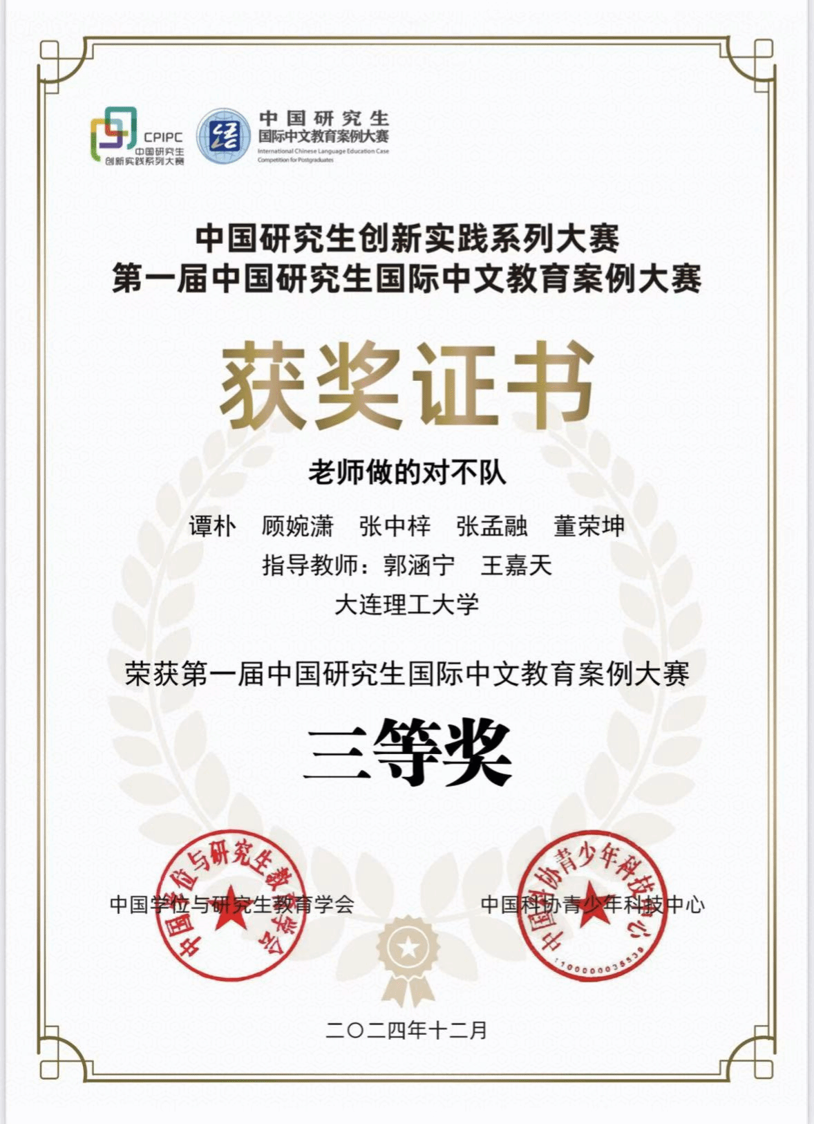 中国研究生国际中文教育案例大赛秉持“标准引领实践,中文拥抱世界”的理念,旨在推动国际中文教学案例的开发与创新,为中国教育国际化发展培养拔尖人才。我校学子在本次大赛中取得的优异成绩,充分体现了大工国际中文教育专业硕士的培养成效,提升和扩大了我校在国际中文教育领域的影响力。未来,国际教育院将持续面向国家发展战略,继续深入推进国际中文、中国文化与国情教学的多元化,将能够讲好中国故事,传播中国声音的中外学生培养和学科建设有机结合,不断提升我校国际中文教师人才培养质量,持续助力学校“双一流”建设与国际化发展。
