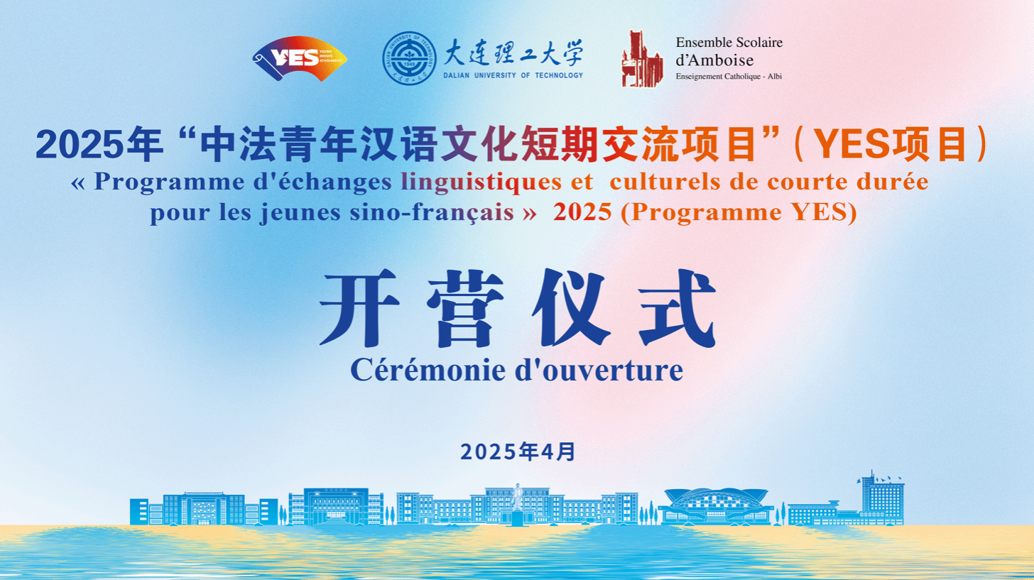 2025年4月3日,由中国教育国际交流协会主办、大连理工大学承办的2025“中法青年汉语文化短期交流项目”顺利开营,本项目属“青年使者交流学习计划”(YES项目)。中国教育国际交流协会副秘书长傅博发表视频致辞,国际教育学院院长段玉平、来自法国阿尔比昂博瓦兹高中的20余位法籍师生,以及国际教育学院师生代表参加了开营仪式。