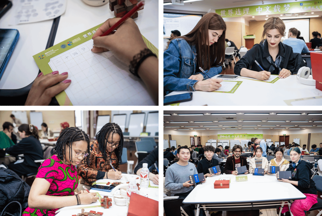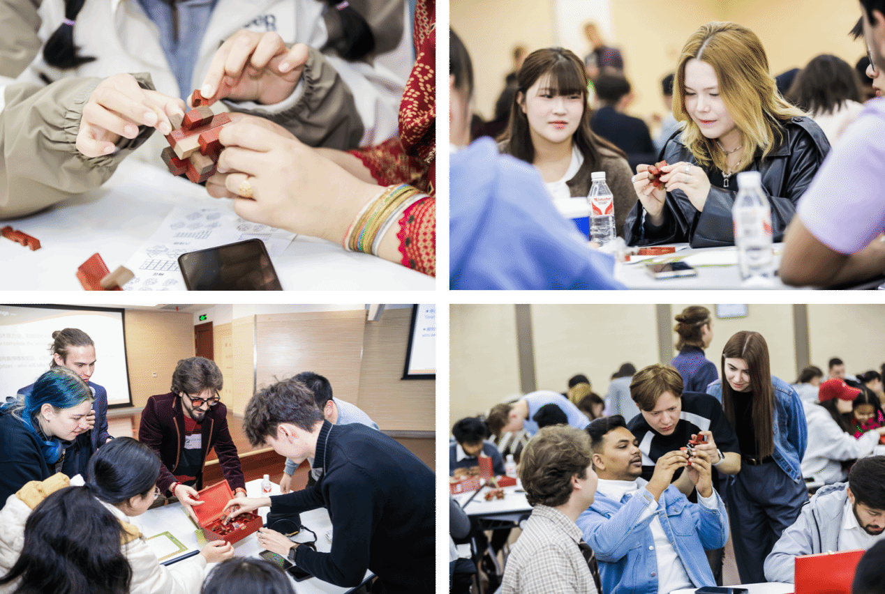 2025年,为了呼应国际中文日“中文:穿越时空的礼物”的主题,活动中,国际学生主持人们像大家介绍了传统经典非遗项目之一--鲁班锁。作为中国发明与创造历史上的代表之一,这一古代土木建筑上的固定结合器,穿越千年,仍然魅力非凡。大部分学生都是第一次近距离体验多种组合形式的鲁班锁,现场工程类专业背景的中外学生更是对这一项目兴趣盎然,同学们被这些完全靠自身结构连接支撑的木条深深吸引,兴奋地动手尝试。虽然有点陌生,拼搭起来也有点难度,但每组同学都表现得十分耐心和投入,在成员们的齐心努力下,计时赛中用时最短完成鲁班锁复原的一组学生获得了“巧手工匠”奖。分享感受时,罗马尼亚籍硕士生李浩然(EMANUEL CURATOREANU)表示,自己一直觉得古代中式建筑特别漂亮,所以才选择了土木工程这个专业,今天尝试了鲁班锁,更是被中国传统工匠的智慧惊艳到,作为理工科的研究生,这种工匠精神的传承和延续让他更深刻的认识到了创造性思维和实践应用的重要性。