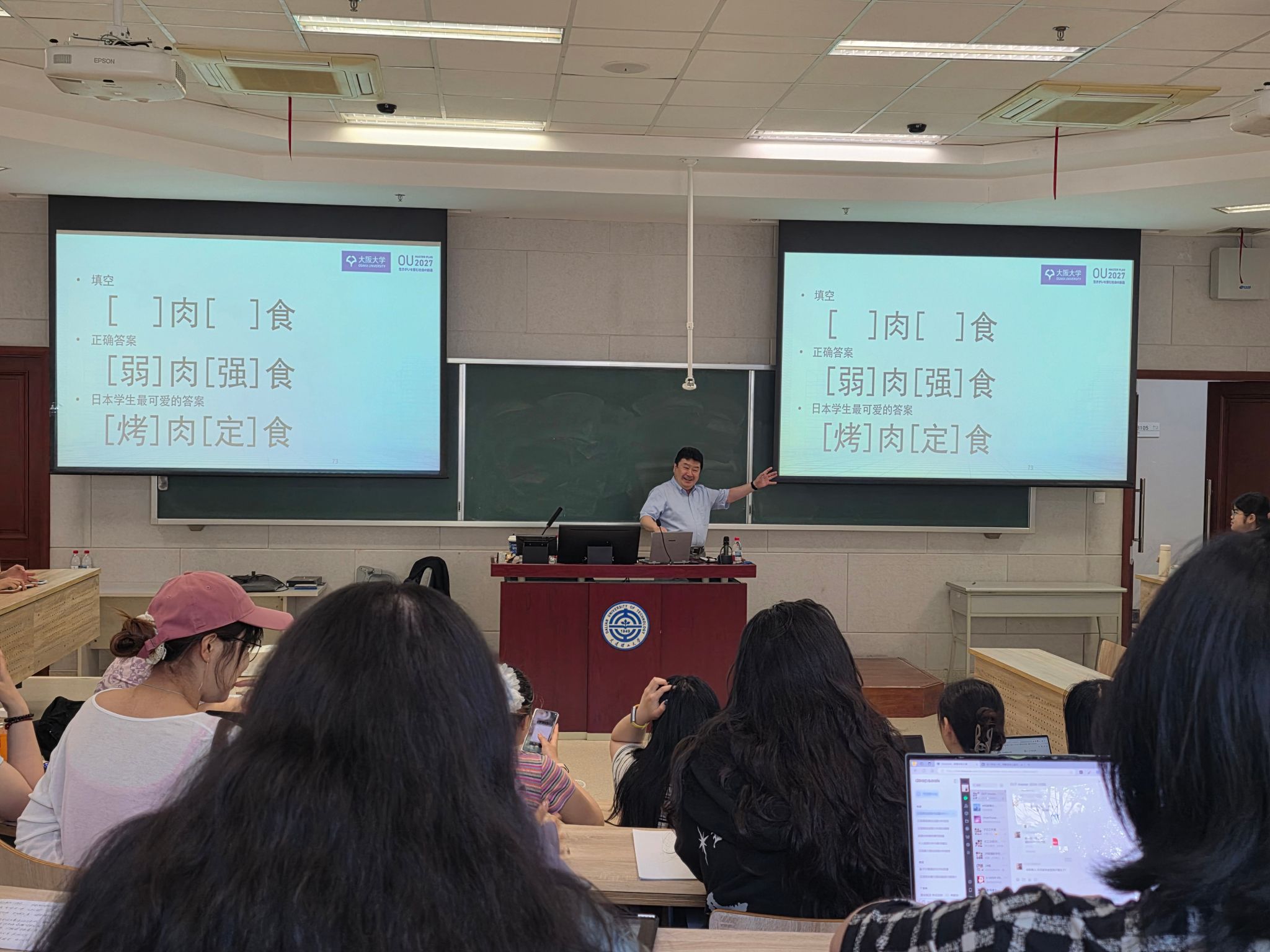 讲座中,古川裕教授并未停留于理论层面,而是通过设计互动环节,将理论与实践紧密融合。他首先引导现场师生亲身参与“对举类词语填空”的互动问答,在活跃的交流中直观体验这一语言现象的魅力与规律。随后,通过对比中日学生对同一段富含对举结构中文对话的理解差异,特别是剖析日本学习者在汉语固定结构搭配上的认知特点,揭示了中文母语者与二语学习者因语感及应用能力差异所形成的迥异理解模式。古川裕教授表示“研究发现,尽管日本学生在汉字习得方面具有先天优势,但在理解和运用汉语特有的固定结构搭配时,却常陷入‘似懂非懂’的困境,缺乏母语者精准的语感和灵活的应用能力。” 讲座最后,古川裕教授与我院师生就如何有效帮助日本学习者克服这一“对”形式的学习难点,展开了更深层次的讨论,共同探索教学实践的优化路径。