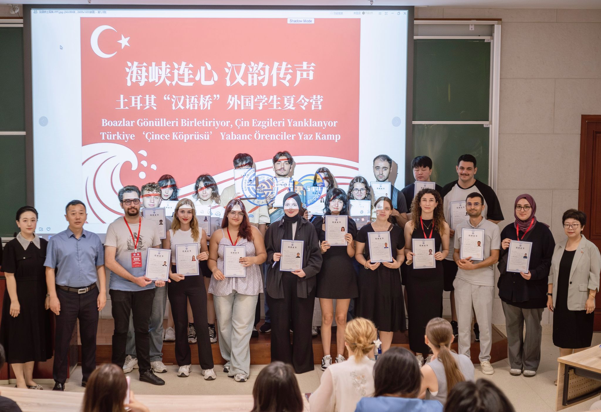 2025年国际教育学院“海峡连心 汉韵传声”土耳其“汉语桥”外国学生夏令营于7月14日至27日在我校成功举办。7月15日上午,开营仪式在海川楼隆重举行,来自土耳其伊斯坦布尔大学中文系的17名学子开启了一段跨越山海的文化之旅。在为期两周的活动中,通过汉语课程、企业参访和文化体验等环节,营员们深入感受了大连的城市魅力,体验了我校的办学特色。