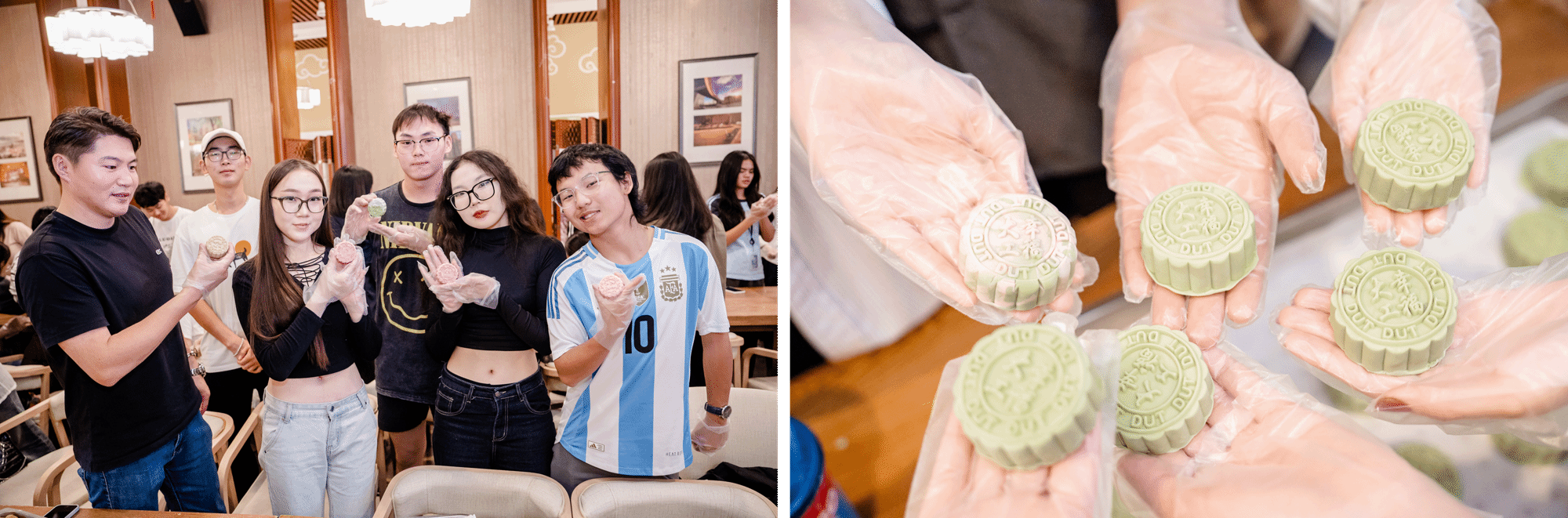 随着一盘盘面粉、馅料与模具摆上操作台,后勤食堂的厨师们来到活动现场,为同学们演示手工月饼制作方法并给予操作指导。操作过程中,同学们互相请教、默契配合,原本陌生的同学因共同的实践变得熟络,小小的操作台成了跨文化交流的温馨平台。