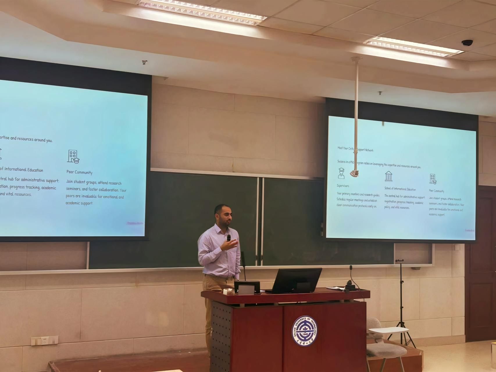 在经验分享环节,特邀嘉宾——生物化工专业的Raheel Asghar博士结合自身科研经历与学术成果,系统梳理了国际研究生在学业过程中的关键节点。他强调大连理工大学对国际研究生的学术规范要求严格,建议同学们熟悉各项政策,充分利用国际教育学院的行政支持、导师的专业指导以及同伴互助网络,构建全方位的学术支持体系。随后,工程管理专业的Azhar Ali博士分享了自身科研经历,鼓励同学们积极关注科研基金申报信息,通过参与项目实践提升研究能力。他还结合个人体会,分享了平衡科研与生活的经验,提倡“高效科研、健康生活”的理念,建议同学们合理规划时间,适当参与体育活动和学术社团,有效缓解科研压力。