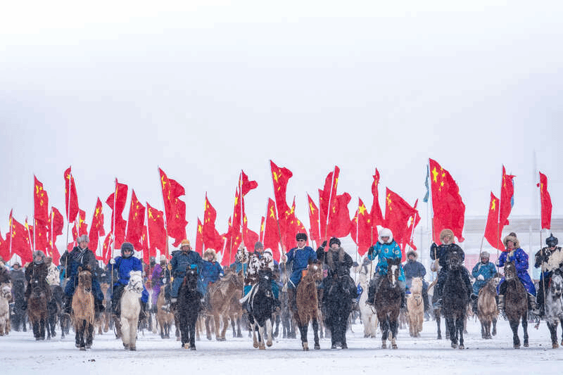 赛场之外,队员们走进在内蒙古冰雪草原上举办的“内蒙古锡林郭勒盟第三届冬季蒙古马超级联赛总决赛”的现场,在领略冬季草原壮美风光的同时,也亲身感受了蒙古族的传统民俗文化体育运动。百匹蒙古马组成的国旗方队高举五星红旗昂首步入开幕式现场,鲜红的旗帜在冰雪草原上迎风飘扬,与万马奔腾的壮阔场面交相辉映,构成了一幅震撼人心的画面。这一幕让留学生队员们的内心受到了强烈的冲击,大家久久沉浸在这份震撼之中,不仅亲眼见证了草原儿女的豪迈气概,更真切感受到了五星红旗所承载的磅礴力量,体会到中国人民心中那份炽热而深沉的红色情怀。