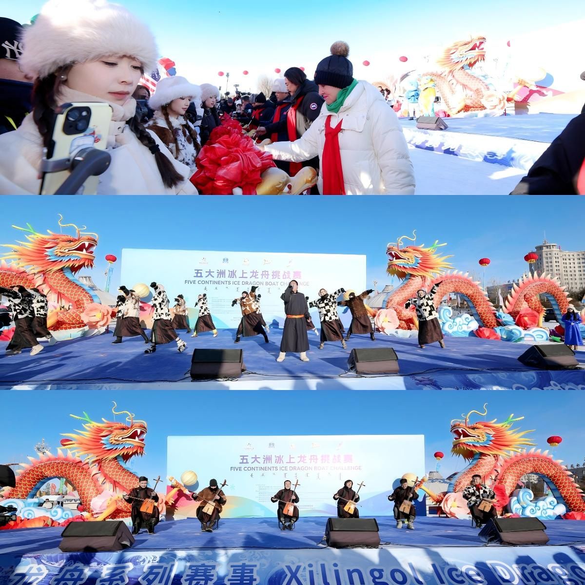 本次赛事由国际冰上龙舟联合会、内蒙古自治区锡林郭勒盟行政公署主办,吸引了来自中国、俄罗斯、美国、英国、德国等全球20多个国家和地区的29支队伍、近600名运动员齐聚锡林浩特市锡林湖冰场。赛事采用积分制,设置12人100米直道赛、5人100米直道赛、12人200米直道赛和12人400米漂移赛四大项目,既考验运动员的爆发力、耐力与操控技巧,也对团队协作能力提出极高要求。作为传统龙舟项目的创新与延伸,冰上龙舟既保留了中华传统民俗的文化底蕴,又融入了冰雪运动的独特魅力,成为展现中国文化创新的重要载体。开幕式上,朱砂点睛的传统仪式延续着龙舟运动的文化根脉,《内蒙古等你来》的悠扬歌声、呼麦与马头琴的经典演绎,将草原风情与中华文化完美融合,让我校留学生队员们沉浸式感受中华民族文化的独特魅力。