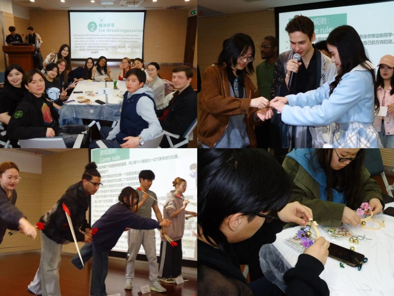 在随后的互动交流中,破冰环节以双语自我介绍的形式展开,大家踊跃表达、真诚交流,现场气氛轻松热烈,迅速拉近了彼此的距离。紧接着,斗草与投壶两项传统游戏轮番上演,同学们分组竞技、默契配合,在欢声笑语中感受古人清明踏青的闲适意趣与传统游艺的智慧魅力。手工创作环节中,同学们利用现场提供的材料自由发挥,制作出一串串独具匠心的春日风铃。作品完成后,中外学生搭档登台,用双语讲述创作灵感与寓意,创意表达与文化交融交相辉映,成为整场活动最动人的画面之一。