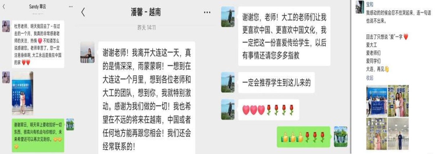 范秋恒写道“大工的老师们让我更喜欢中国文化,我一定把这一份喜爱传递给学生,推荐学生到这里来。”潘馨同学也说“我也希望在不远的将来在越南,中国或者任何地方能再跟您相会!”豆氏翠云写道“大工永远是我在中国的家。”阮氏宝和同学在朋友圈写道:我感动的时候会忍不住哭起来,连一句话都说不出来。回去了只想说“爱”一个字,爱大工,爱老师们,爱同学们,大连再见!
