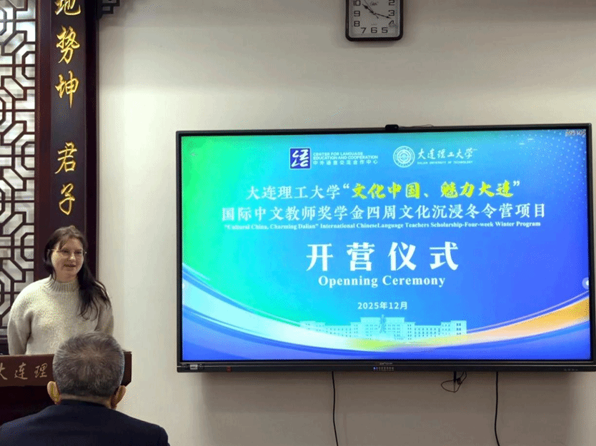 随后,国际教育学院汉语教师孙佳代表教师团队发言。她介绍了冬令营的课程设计与活动安排,强调将围绕“语言学习+文化体验”双主线开展教学,并结合大连独有的冬季风光与冰雪文化,设计了系列沉浸式体验环节。她寄语学员珍惜此次冬日相聚的机会,积极投入学习与实践。