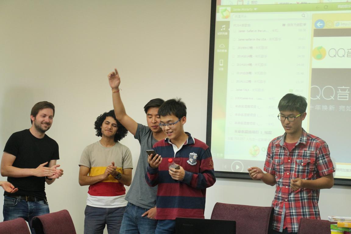 随后大家一起进行了英语单词接龙和Typhoon游戏,最后德国和也门国际学生Mark和Hesham小组表演了一首MJ的歌曲《Heal the world》。