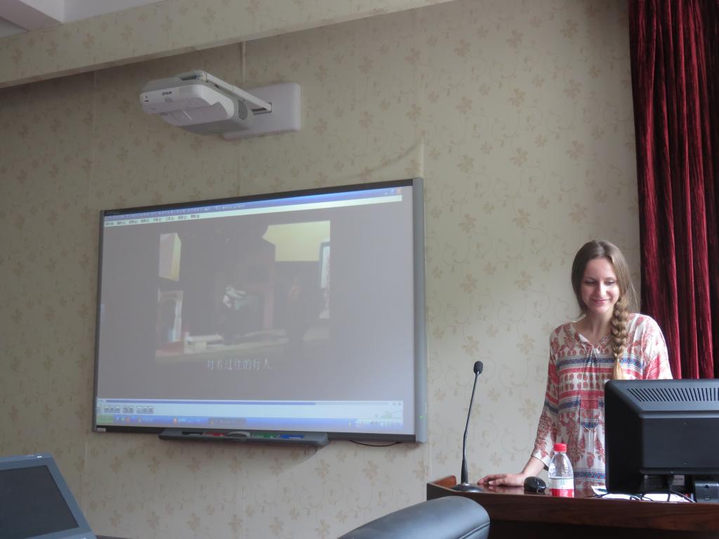 之后,俄罗斯的薇达同学,向大家介绍俄罗斯拥有众多民族,自然风光秀美,传统菜肴的种类,并播放视频向大家介绍俄罗斯的动画片。