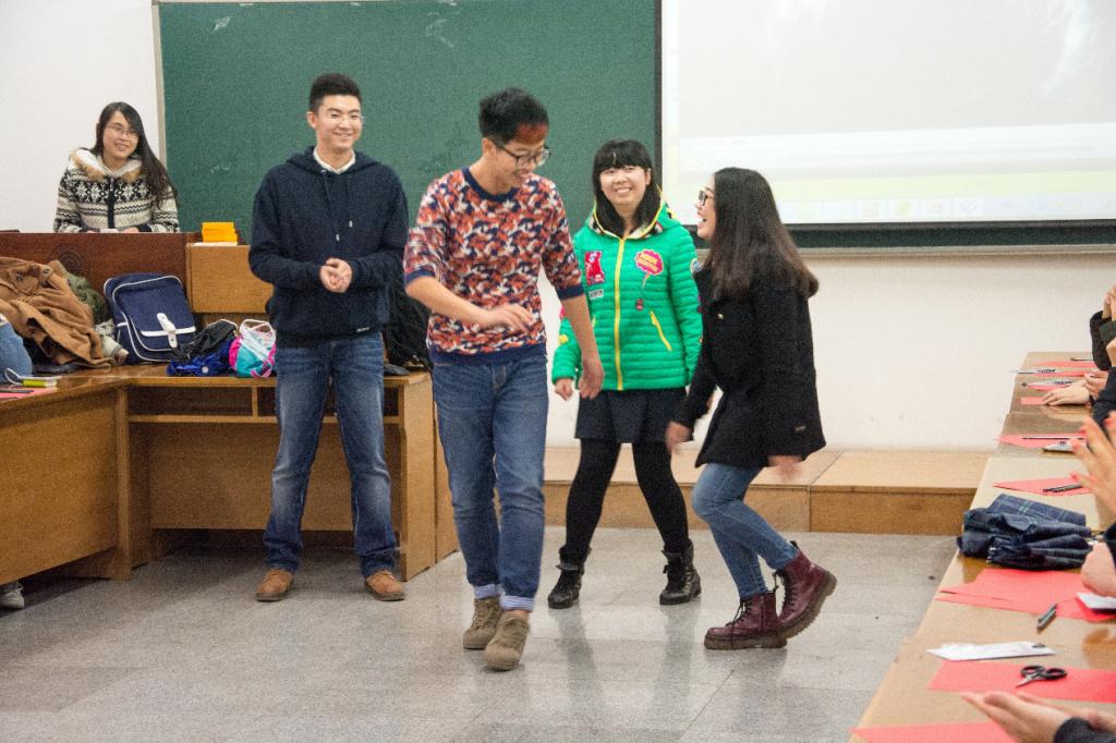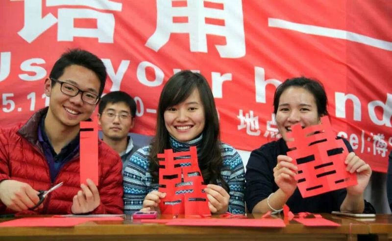 表演之后便到了有趣的游戏环节里,这次共有三个中国传统的活动环节。在剪纸环节中,第一次拿起剪刀剪纸的留学生们跟着志愿者一起,剪出一个个“喜”字,现场沉浸在红色的幸福中,仿佛感受到中国传统婚礼的独特魅力。