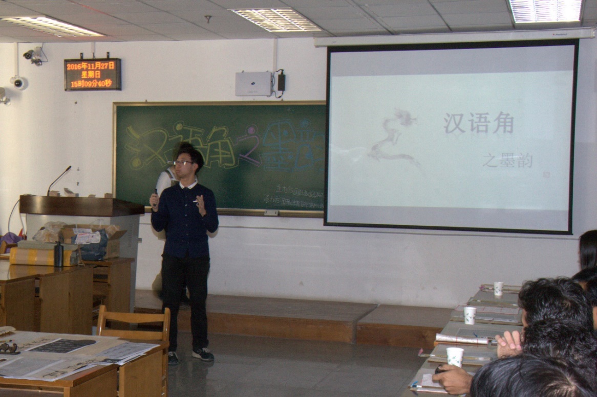 11月27日下午,第一期“华韵大工”汉语角活动之“墨韵”成功举办。此次活动由国际教育学院和外国语学院共同主办,志愿者学习部承办,参加活动的国际学生来自德国、约旦、白俄罗斯、日本、韩国等20余个国家。活动以“墨韵”为主题,通过向国际学生介绍汉字与书法,让国际学生亲身体验与感受中国文化的独特魅力。