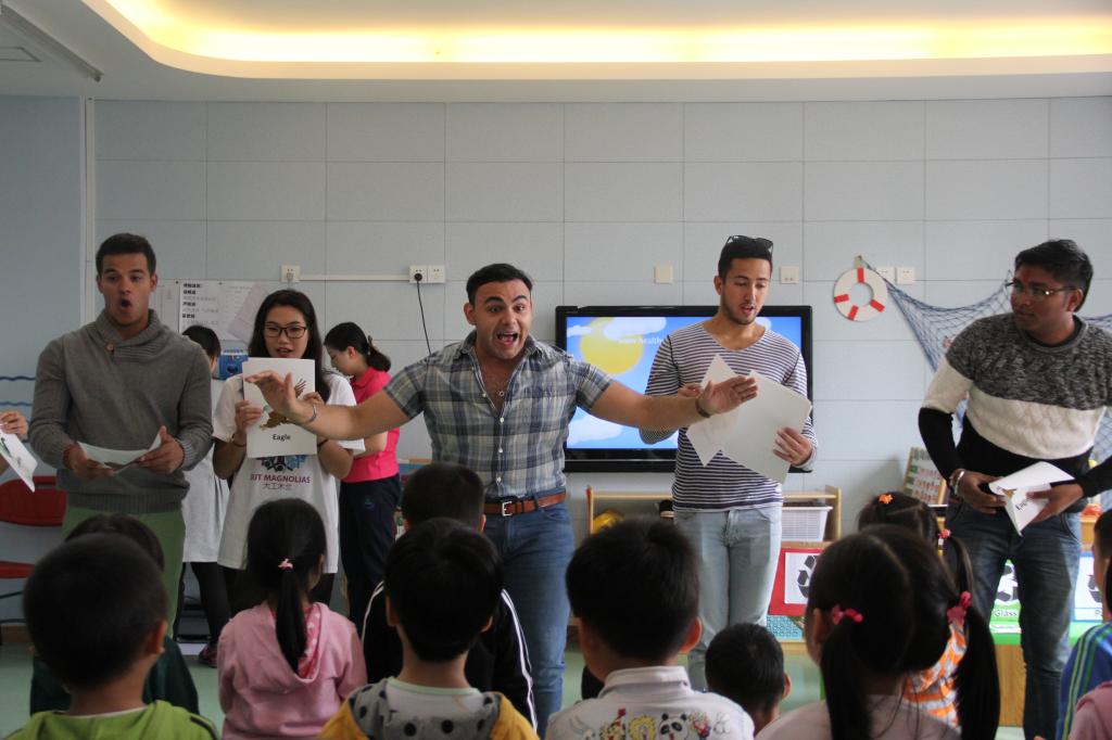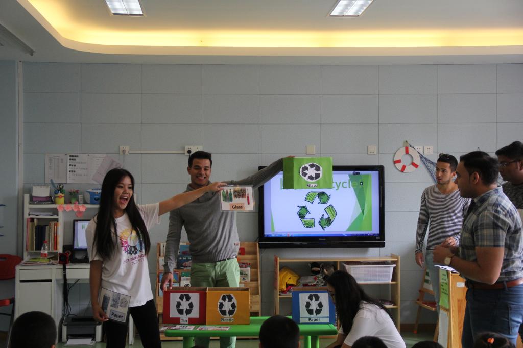 参与此次环保讲堂的六名国际学生分别来自委内瑞拉、蒙古等六个不同的国家。简单的自我介绍后,来自委内瑞拉的学生John教小朋友们学唱起环保歌曲"THE EARTH DAY RECYCLING SONG",小朋友们边唱边跳,欢快地模仿起老鹰、大象等各种动物。