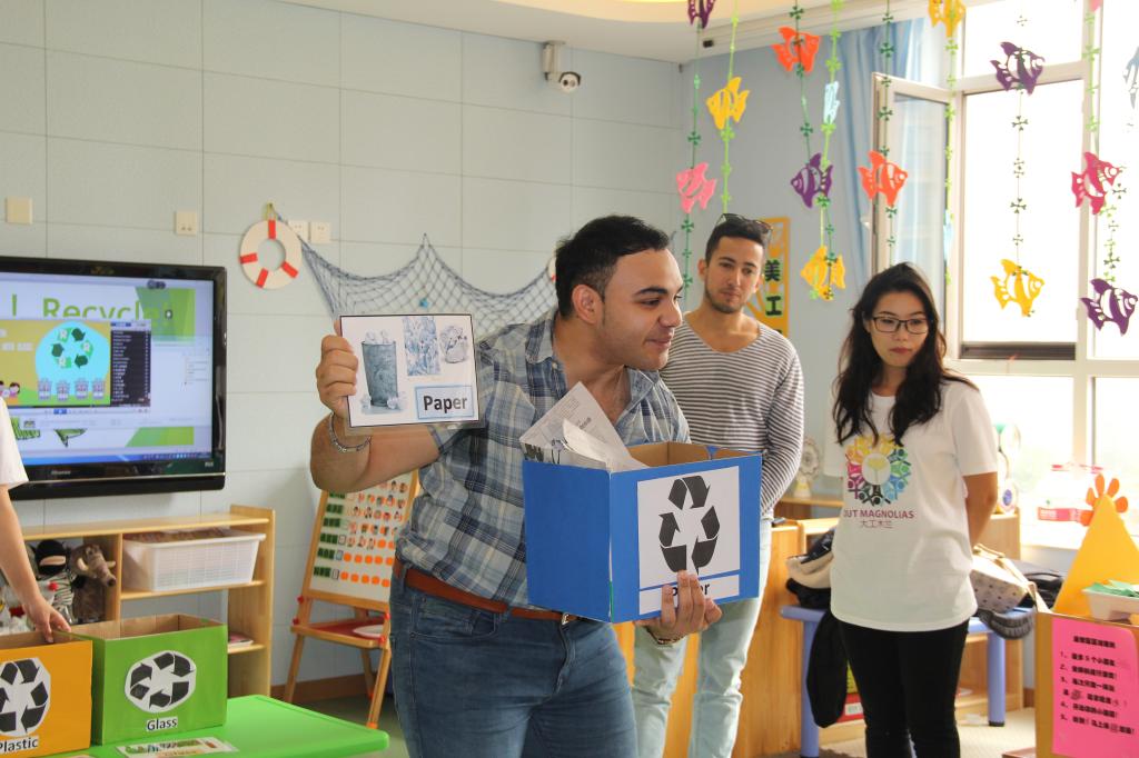随后,”大工木兰”主席,来自哥斯达黎加的学生Sue用PPT的形式为小朋友们展示了几种被污染和未被污染的场景,通过对比来引导大家思考造成环境污染的原因。小朋友们纷纷发言,表达了自己对环保问题的想法。环保习惯要从小培养,”木兰”们特意准备了垃圾分类箱,教小朋友们如何把塑料、玻璃瓶、易拉罐、纸张等垃圾放到正确的回收箱里。