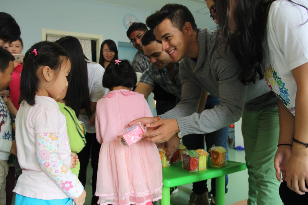 讲堂的最后,三十多名小朋友分成六组,通过大家的共同努力和配合,完成了一幅漂亮的手掌水彩画。国际教育学院老师还专门为小朋友们准备了礼物并一一发放到小朋友手中。