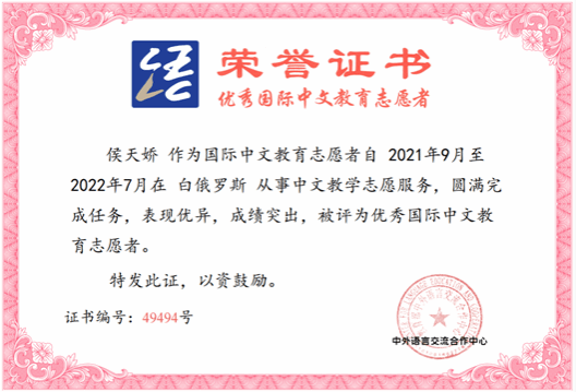 侯天娇老师于2021年9月到白大孔院下设布列斯特第7中学教学点赴任,那里汉语教师严重不足,教学工作量非常大,但她仍旧以专业的教学能力和端正的工作态度完成了所有教学任务。她团结同事,关爱学生,受到学校老师和学生的高度评价。