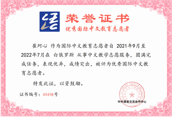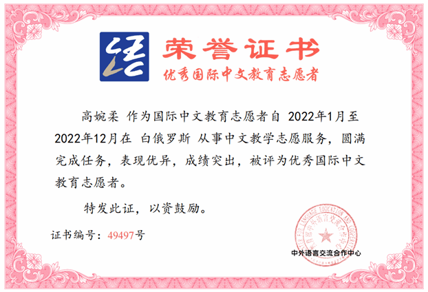 经过教育部中外语言交流合作中心的2022年度全球国际中文教育优秀志愿者评选,白大孔院高婉柔、崔珂心、侯天娇3位教师荣获“优秀国际中文教育志愿者”称号。