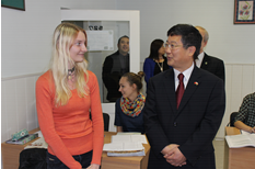 随后,崔大使欣然接受了正在孔院上课的中学生想要表演节目的请求。一曲《中国话》道出了白俄罗斯青少年对于中国的无限向往和对汉语的无比热爱。崔启明大使及夫人对孩子们的汉语称赞有加并与他们亲切地合影留念并同学习中国文化的大学生们亲切地交流,整个教室都沉浸在欢声笑语中,白俄罗斯的大学生们对和蔼可亲的中国大使表现出了无比的喜爱和崇敬。